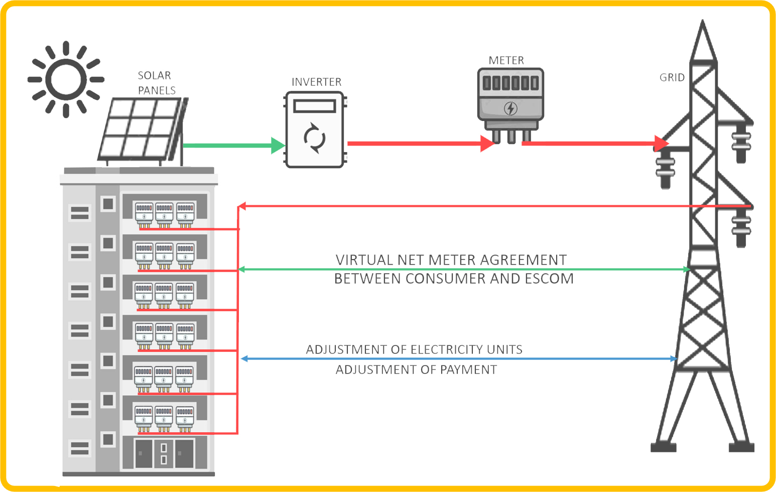 A group of consumers can jointly own a solar plant within the common premises and use the electricity generated to offset their consumption. Consumers setup a Renewable Energy System(RES). The entire energy generated/injected is exported to the grid through an energy meter. The energy exported is adjusted in more than one electricity service connection(s) of participating consumers. The group of consumers electricity service connection(s) and RES Should be within same distribution licensee’s area of supply. Instead of individual RTS plants, a single large plant has the benefit of economies of scale. Easier O&M with reduced cost and higher generation.